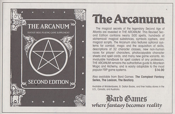 On this same page is an ad for The Arcanum (second edition), a now legendary third-party book that some people integrated into their D&D games. It had a ton of new classes and various ritual spells and so on if I remember correctly. It was a font of homebrew ideas from my perspective. Anyway, I had a copy briefly and regret getting rid of it. At some point I got it in my head that “officialness” mattered and I dumped the book. The fact that a friend gave me the book, rather than having paid for it myself, made it easier, I guess. Teens are dumb. The internet tells me that there was a crowd-sourced reprinting in 2019, but I have my eye on a couple of vintage copies on eBay.