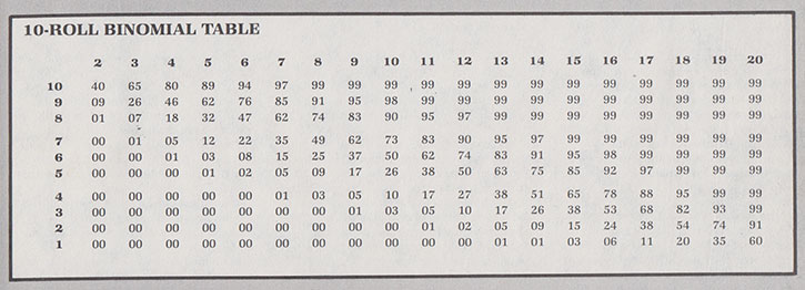 “Now let’s consider a concrete example: The “10” on the 5-Roll Binomial Table. There is an 11-in-20 chance of rolling a 10 or better on a 20-sided die, which corresponds to a .55 probability. Since the five rolls are independent, the probability of them all being 10 or higher is found by multiplying them together: .55 multiplied by itself five times equals .0503, or about 5%. Subtracting 5 from 100 yields 95; this is the number that must be rolled on the percentile dice to simulate rolling 10 or higher five consecutive times on a 20-sided die.”