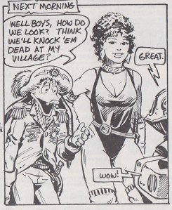 Other articles found in this issue include a short review of the Ultima IV computer game (I never played it), an article on adding a lot more realism and detail to saddles and how they are used in your AD&D game, additional rules adding complexity to TSR’s Conan Role-Playing Game (which came out in 1985 and was designed by the man who’d do most of the revision of AD&D into 2nd Edition, Zeb Cook), rules for military aircraft in TOP SECRET, Hunter-class robots for Gamma World (I remember creating a version based on these for Star Frontiers), and “MINIMAGIC,” two facing pages with Marvel Superhero dioramas featuring miniatures of characters like Doc Ock, Spider-Man and Dr. Strange. The photos aren’t great. They are too dark and rendered with insufficient detail. Sad. “Star Cops” gives us a look at law enforcement in the Traveller game. There is no Ares section anymore, but there seems to be just about as much sci-fi, modern, and superhero stuff as when there was…at least so far.Wormy is a delight, as it frequently is, Dragonmirth is best left unmentioned, and in SnarfQuest Snarf and Telerie climb aboard a spacecraft, learn about their planet and where Aveeare comes from, meet another robot, and then take off to return to Snarf’s village, as it has been a year since he left and he has to get back in that time for some reason I can’t remember. Oh, and there is a little more creepy stuff. Snarf keeps the robots from telling Telerie that the lingerie she chooses to wear from among the “exotic clothes” on the ship may not be appropriate for everyday wear, so that he can ogle her. The whole “joke” suggests both that Telerie is too stupid to understand what these clothes show off, and finds humor in Snarf’s leers. It just reads as sophomoric to me, and the fact that I was indeed a sophomore in high school at this time, I can confirm that I was an appreciative audience. Reading it now makes me feel oogy.