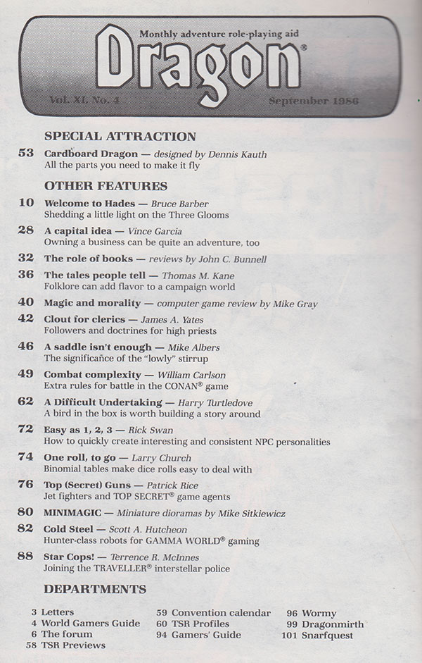 I can’t say I ever really used anything from this issue, and only the now missing cardboard dragon and “One Roll, to Go” are at all memorable to me. Ultimately, I do like “Welcome to Hades,” even if I am unlikely to ever make use of it, and I am glad I read Turtledove’s story just for the idea it gave me. And heck, that is how a magazine like this works best, in my opinion, as a source for inspiration.
