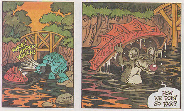 The cover—Robin Wood’s third contribution—is entitled, “What a Knight for Apparitions.” I like a punny title, but yeesh! It shows a young warrior down on one knee receiving a glowing sword from the ghost of a young woman with flowing wavy hair. They are in the middle of ruins, and the night sky twinkles in the background. I didn’t think much of it as a kid, but looking at it now I appreciate it more. There are details, like the broken sword and the helmet on the ground, the look of the ruins, that make the image seem less like a moment frozen in time and more like part of an unfolding story. Still, I think the weakest part is the apparition herself. She just is a little too wispy for how the image is rendered and lacks visual substance, something that, as one of the two central figures of the image, she needs to have, even if she lacks actual substance in the storyworld of the painting.